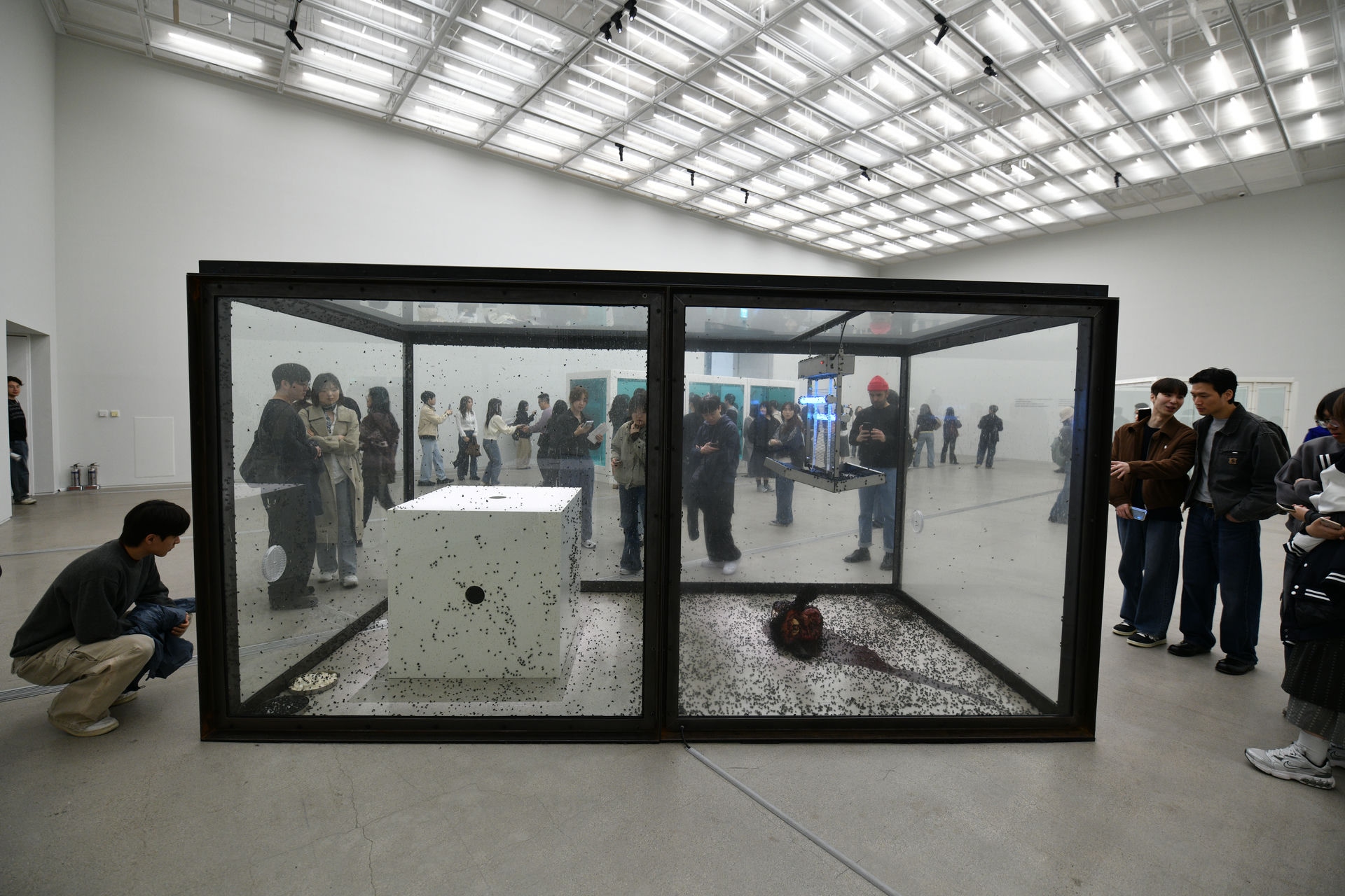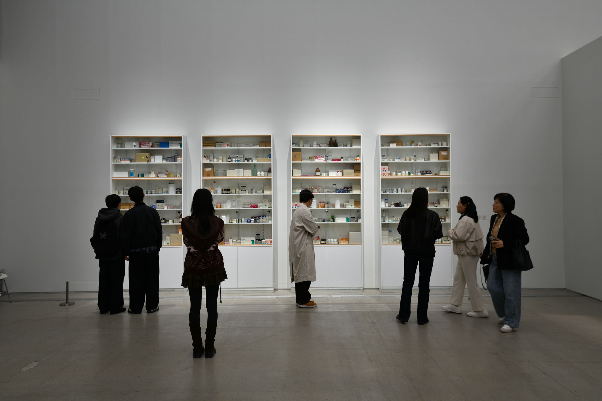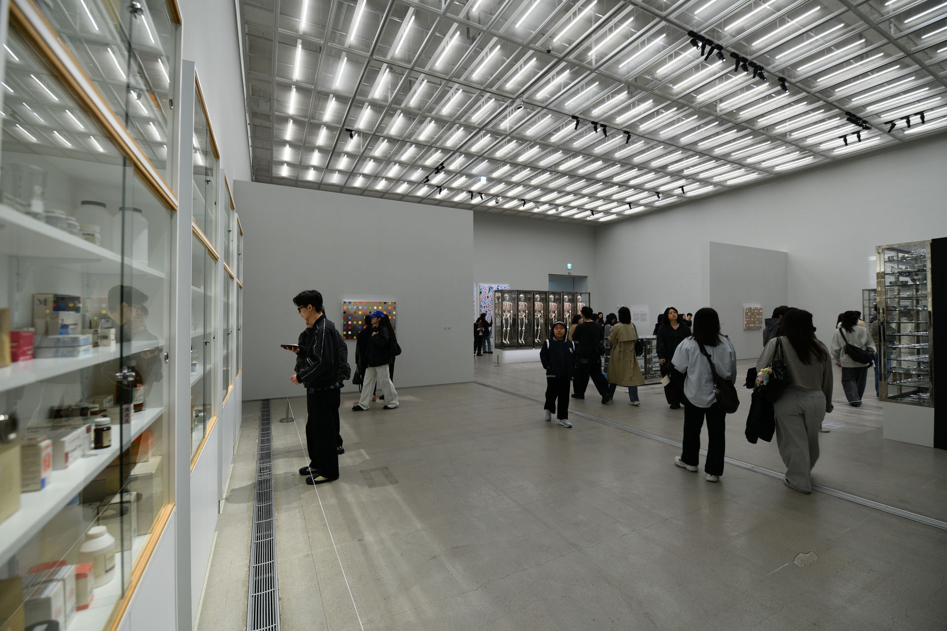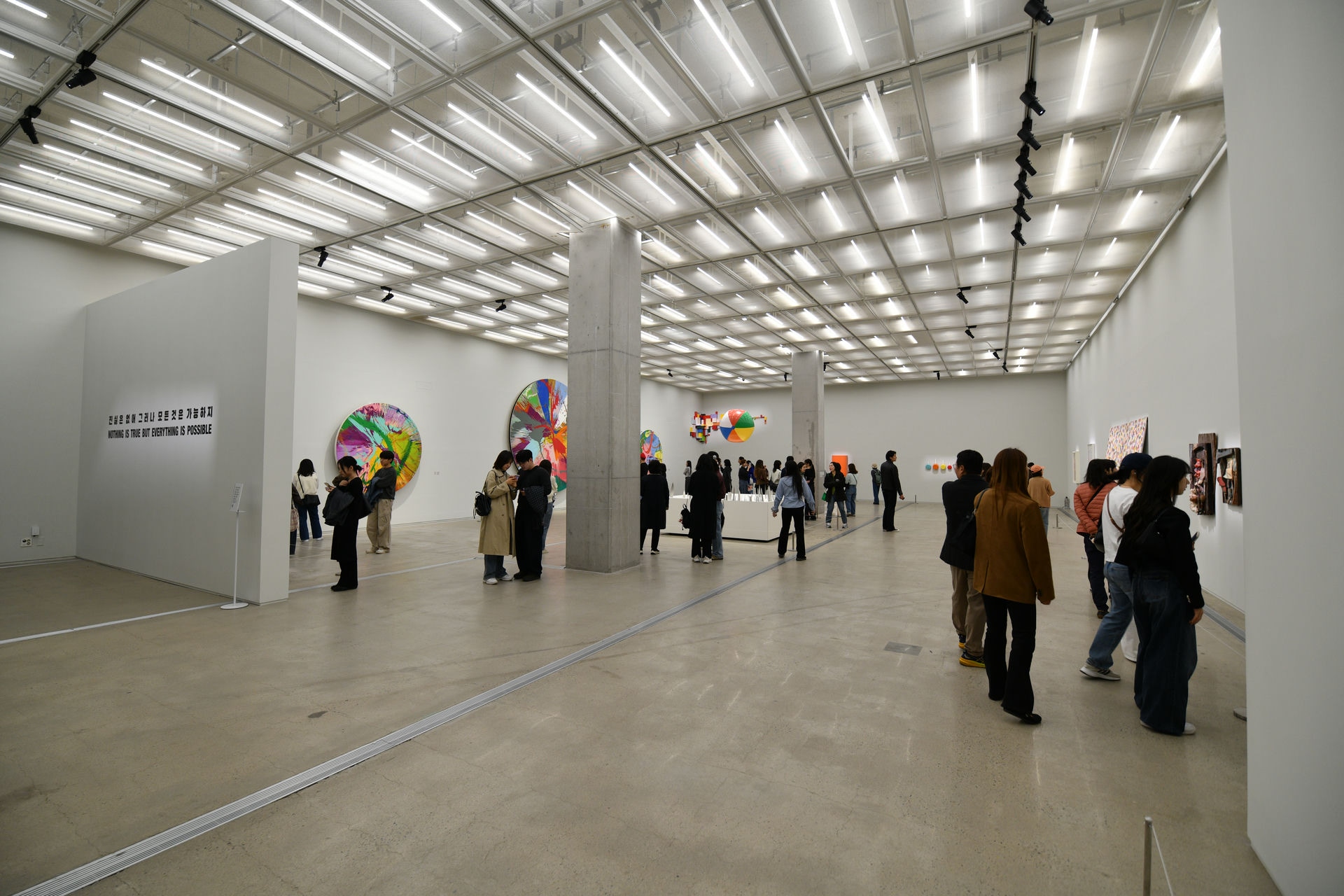 News 국립현대미술관 서울 전시, 데이미언 허스트: 진실은 없어 그러나 모든 것은 가능하지 Exhibition 2026-03-29 Keywords 국립현대미술관서울 데이미언허스트 진실은없어그러나모든것은가능하지 삶과죽음 자화상 우리는모두죽는다 스핀페인팅 사랑의취약성 천년 죽음의공포 살아있는자의마음속죽음의불가능성 수조상어 침묵의사치 영생욕망 초월적믿음 과학맹신 수집과통제 욕망 알약캐비닛 집착 강박 신의사랑을위하여 욕망과무상함 나비날개 영혼과부활 죽음의역설 약국레스토랑 예술처방 리버스튜디오 작업실 리버페인팅 국립현대미술관 서울에서 진행 중인 『데이미언 허스트: 진실은 없어 그러나 모든 것은 가능하지(Damien Hirst: Nothing Is True But Everything Is Possible)』 전시는 깊은 영감의 단초가 되어줄 것이다. 포름알데히드 용액 수조에 잠긴 거대한 상어와 다이아몬드로 빛나는 인간 두개골로 유명한 스타 작가 데이미언 허스트의 깊은 내면 세계를 탐험할 수 있는 전시다. 그는 삶과 죽음이 결코 분리될 수 없음을 깊이 인식하며, 죽음을 단순히 무서운 존재가 아닌, 오히려 삶을 기념하는 독특하고 창의적인 방식으로 표현한다. 이번 전시는 그의 작업이 전시장 내부뿐 아니라 과거에 머무는 한계를 넘어, 유니콘 조각 등 대형 작품들이 서울박스 공간을 가득 메우고, 작업실에서 제작 중인 작품까지 생생하게 공개되어 그 예술적 여정의 현재와 미래를 고스란히 보여준다. 1. 모든 질문에는 의심이 따른다 데이미언 허스트의 20대 작품들로 구성된 첫 번째 섹션에서 그의 중요한 예술 개념과 형성 과정을 확인할 수 있다. 20대 초반부터 세상의 주목을 받은 그는 기존 제도와 고정관념에 도전하며 자신만의 독창적인 예술 세계를 꾸준히 구축해왔다. 1965년 브리스틀에서 태어나 리즈에서 자란 그는, 반항심 가득한 시기에 드로잉이라는 표현의 자유를 유일한 탈출구로 삼았다. 그러던 중 16세 때 미생물학 공부하던 친구 따라 시체 안치소에 갔다가, 잘린 시신 머리 옆에 두고 몰래 사진 찍은 경험은 이후 그의 작업에 죽음에 대한 관심으로 드러나게 된다.[자화상, 1987] 골드스미스 대학교 시절 만든 작품으로, 작가가 자신의 셔츠에 ‘In This Dream’이라는 자수와 서명을 새겨, 철제 옷걸이에 걸어 벽에 설치했다. 이 시기 그는 다양한 조형 실험을 통해 예술적 정체성을 모색했다. [죽은자의 머리와 함께, 1991] 작가는 첫 개인전에서 10년 전 찍은 사진을 소재로 한 작품을 선보였다.[우리는 모두는 죽는다, 1985] 그는 회화에 대한 무력감을 콜라주라는 새로운 표현 방식으로 극복했다. 런던으로 이사한 후, 옆집 노인의 실종을 목격하고는 노인의 빈 집에서 모은 오브제를 콜라주 작품에 사용했고, 이를 통해 죽음으로 향하는 긴 여정을 상징적으로 담아냈다. 전시장 곳곳에서 작품을 감상하던 중, 갑작스러운 ‘펑’ 소리가 울려 퍼져 관람객 모두를 놀라게 했다. 소리가 난 전시장 중앙에 위치한 <사랑의 취약성(2000)> 작품 주위로 관람객들이 자연스럽게 모여들었다. 바로 전까지 공중에 떠 있던 풍선이 아래로 떨어져 날카로운 칼날에 닿아 터진 순간이었다. 그 후 긴 정적이 흘렀고, 작은 기계음과 함께 풍선은 다시 하늘로 떠올라 일상으로 돌아갔다. 작가는 이 퍼포먼스를 통해 삶과 죽음에 맞서는 인간의 복합적인 감정을 관람객이 직접 체험하게 하고, 그 감정을 행동으로 옮기도록 유도했다.2. 우리는 시간 속에 산다 두 번째 세션에는 죽음의 공포와 삶과 죽음의 순환을 강렬하게 시각화한 데이미언 허스트의 대형 설치 작품들이 전시되어 있다. 그는 런던으로 이주해 본격적으로 미술을 공부하기 시작했으며, 골드스미스 대학교 재학 시절인 23세에 직접 기획한 그룹전 <프리즈(1988)>를 통해 대중의 주목을 받았다. 1990년대 초 발표한 <천 년>과 <살아 있는 자의 마음속 죽음의 물리적 불가능성>은 금기에 도전하는 파격적인 소재로, 발표 당시부터 큰 화제를 모은 초기 대표작들이다.인간은 본능적으로 죽음을 두려워하지만, 정작 자신의 죽음에 대해서는 실감하지 못한 채 하루하루를 살아간다. 이 모순적인 심리 속에서 관객은 거대한 유리 구조물 너머로 죽음의 냉혹한 물리적 실체와 마주하며, 공포와 혐오, 호기심과 불편함이 뒤섞인 복합적인 감정을 경험하게 된다. 그는 유리 구조물을 통해 관객이 작품 속을 들여다볼 수 있게 하면서 동시에 직접 개입하지 못하도록 연출한다. 이러한 물리적 경계는 죽음이라는 피할 수 없는 운명을 마주하며 살아가는 인간의 냉정한 현실을 상징적으로 보여준다.[천 년, 1990] 생명이 시작되고 생존을 향한 본능이 반복되는 가운데, 무작위적이며 냉혹한 죽음이 계속되는 자연의 엄혹함을 보여준다. 잘린 소머리와 파리 유충, 살충기로 구성된 이 설치물은 유리장 안에서 부화한 파리들이 흐르는 피를 찾아 이동하지만, 살충기에 걸리면 곧바로 죽음을 맞이하도록 설계되어 있다.[살아있는 자의 마음 속 죽음의 불가능성, 1991] 포름알데히드 용액 수조에 거대한 상어를 넣은 설치미술로, 관객에게 죽음의 공포를 생생히 전하면서도 인간이 죽음을 실감하지 못하는 내면의 역설을 드러낸 