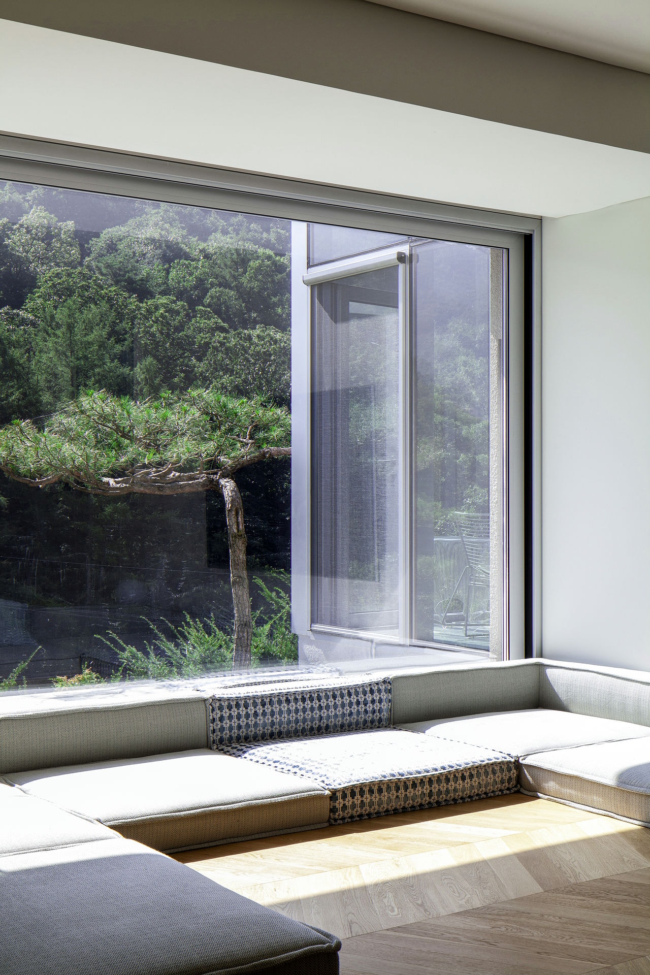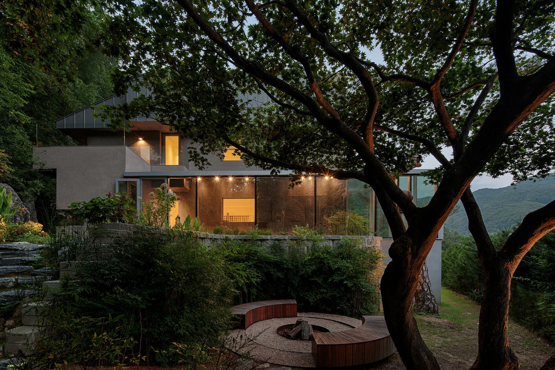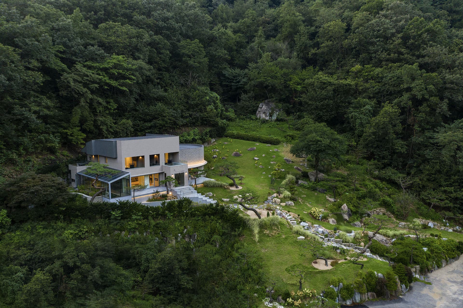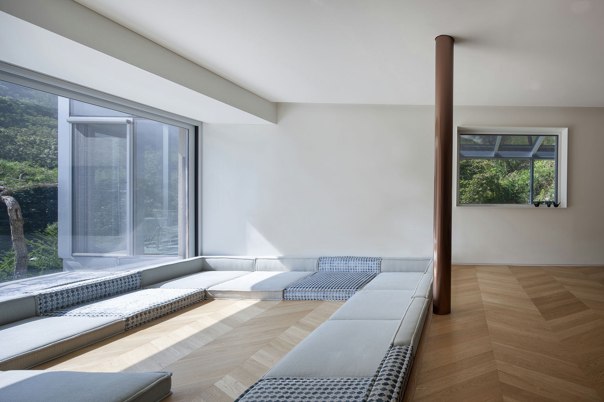 프로젝트 빌라렌토ㅣ백에이어소시에이츠 서울 근교, 번잡하고 산만한 것들을 여과하는 긴 산길을 따라 오르다 보면 깊고 고요한 마을 끝에 다다른다. 바쁘고 버거웠던 도시의 템포가 잊히는 장소이다. 우리는 예술과 자연을 아낌없이 찬미하는 이들의 느리고 안녕한 시간의 흐름을 되찾아줄 서정의 공간, 빌라렌토를 이 곳에 구축했다. Keywords 100Aassociates 100A 백에이어소시에이츠 백에이 안광일건축가 박솔하건축가 VILLALENTO 빌라렌토 고요한마을 도시의템포가잊히는장소 술과자연 느리고안녕한시간 서정의공간 자연과여가를사유할수있는공간 휴양공간 유럽의한적한마을 자연의빛깔투영 여가의공간 사적인휴식 수영과사우나 음악실 빈티지 자쿠지 필란드식사우나 독립된베란다 서울에 거주하고 있는 클라이언트는 서울근교에 자연과 여가를 사유할 수 있는 공간이자 그들의 소중한 사람들과 공유할 수 있는 휴양공간을 필요로 했고, 산머리에 숲을 등지고 주변을 한눈에 조망할 수 있는 약 20년 정도 된 주택을 구입했다. 우리는 건축을 올려다보며 진입해야 하는 진입방식과 기존 건축의 형태 그리고 클라이언트의 취향을 고려해 유럽의 한적한 마을 어딘가에 있을법한 작은 저택을 상상하며 요란했던 형태를 단순하게 다듬고 시간의 깊이가 더해질 질감과 색감들을 입히면서 자연의 빛깔을 투영하기를 바랐다.두 개의 층으로 나누어진 공간은 함께 여가를 나눌 수 있는 층과 사적인 휴식을 음미할 수 있는 층으로 나누었다. 1층 여가의 공간은 함께 음식을 나누고 대화하며 음악을 듣고 수영과 사우나를 즐길 수 있는 공간으로 창을 통해 내부로 들어오는 자연의 아름다움을 해치지 않도록 낮고 단순한 형태를 갖게 하되 유니크한 요소들을 배치하여 클라이언트의 취향을 반영했다. 빈티지 스피커와 LP를 수집하는 클라이언트의 음악실은 기존 거실로 사용되었던 공간으로 (빈티지 스피커에서 영감을 받아) 촌스럽지만 독특한 천장의 형태를 그대로 사용하고 붉은 목재를 사용해 어수룩하고 투박한 분위기에서 섬세한 음향으로 음악을 즐길 수 있도록 했다. 2층 휴식의 공간은 복도를 중심으로 4개의 침실, 자쿠지와 필란드식 사우나를 포함한 공용욕실 2개가 있는데 각 공간마다 창과 독립된 작은 베란다를 배치해 자연을 조망하며 사적인 휴식을 충분히 음미할 수 있도록 했다.그는 소년과 같은 마음으로 이 공간의 과정을 관찰하고 기록하고 질문했다. 매 순간 호기심 어린 눈으로 바라보던 그의 총기는 지독하게 소란스럽고 산만한 우리를 반성하게 했다. 우리는 단순하게 여가와 휴식을 사유하는 공간이 아니라 그들에게 안녕한 시간의 흐름을 되찾아줄 공간이 되길 바라면서 이 공간에 빌라렌토라는 이름을 남긴다.빌라렌토 VILLA LENTOㅣ100A associates 2021 위 치 | 경기도 광주시 퇴촌면 Gwangju-si, Gyeonggi-do면 적 | 313.80㎡외 벽 | 치장벽돌, 테라코 사하라 마감바 닥 | 고흥석, 원목마루, 타일, LVT 마감 벽 | 템버보드, 타일, 도장 마감천 정 | 도장 마감창 호 | 시스템 창호설계 | 백에이어소시에이츠 100A associates대표 건축가 | 안광일 Kwangil An, 박솔하 Solha Park글 | 백에이어소시에이츠 100A associates사진 | 김재윤 Jaeyoun Kim
