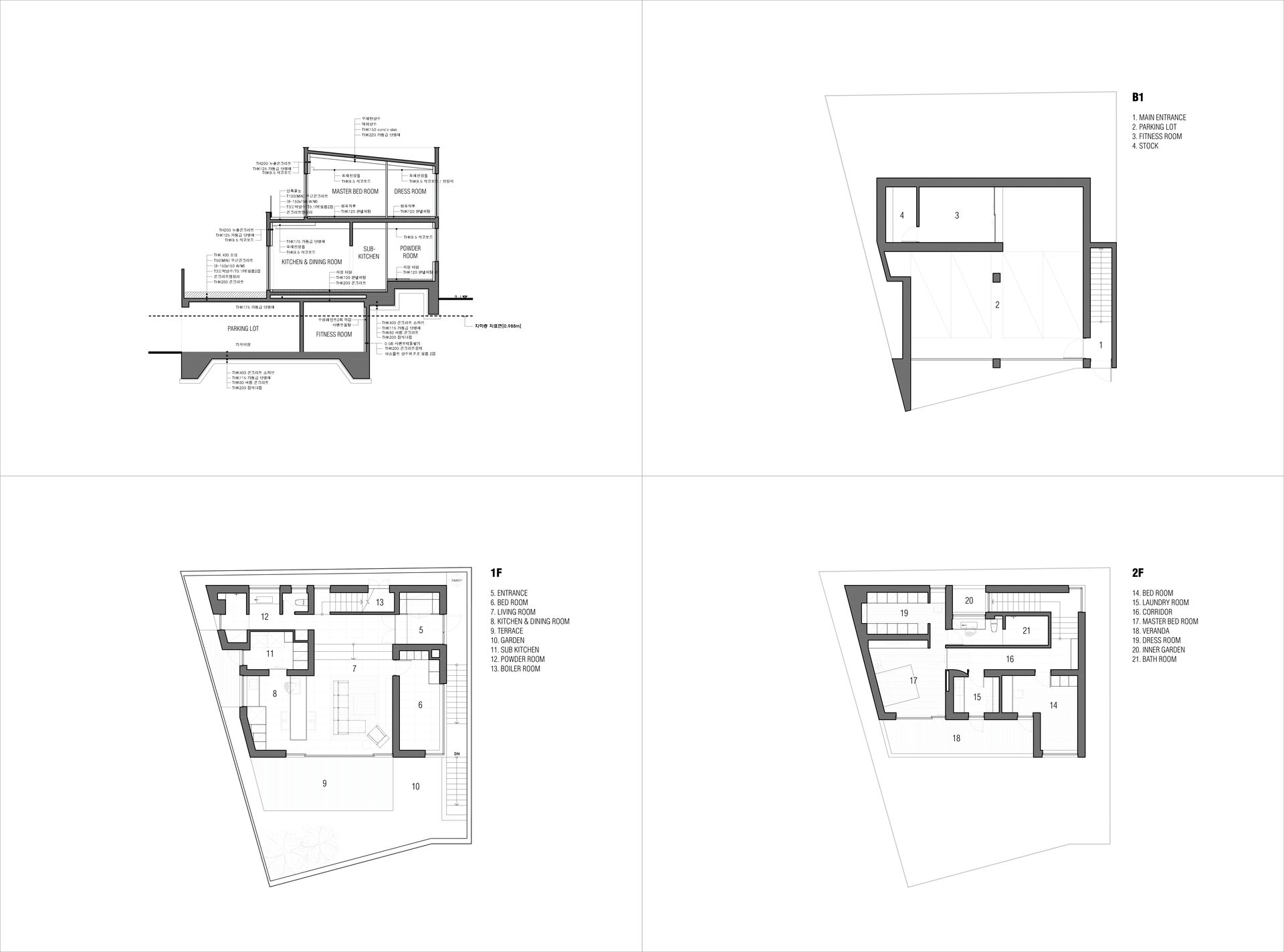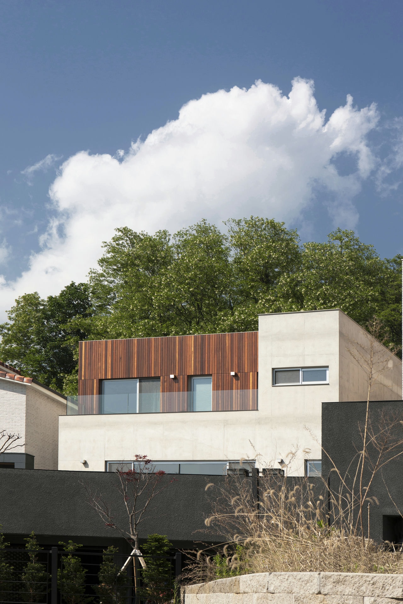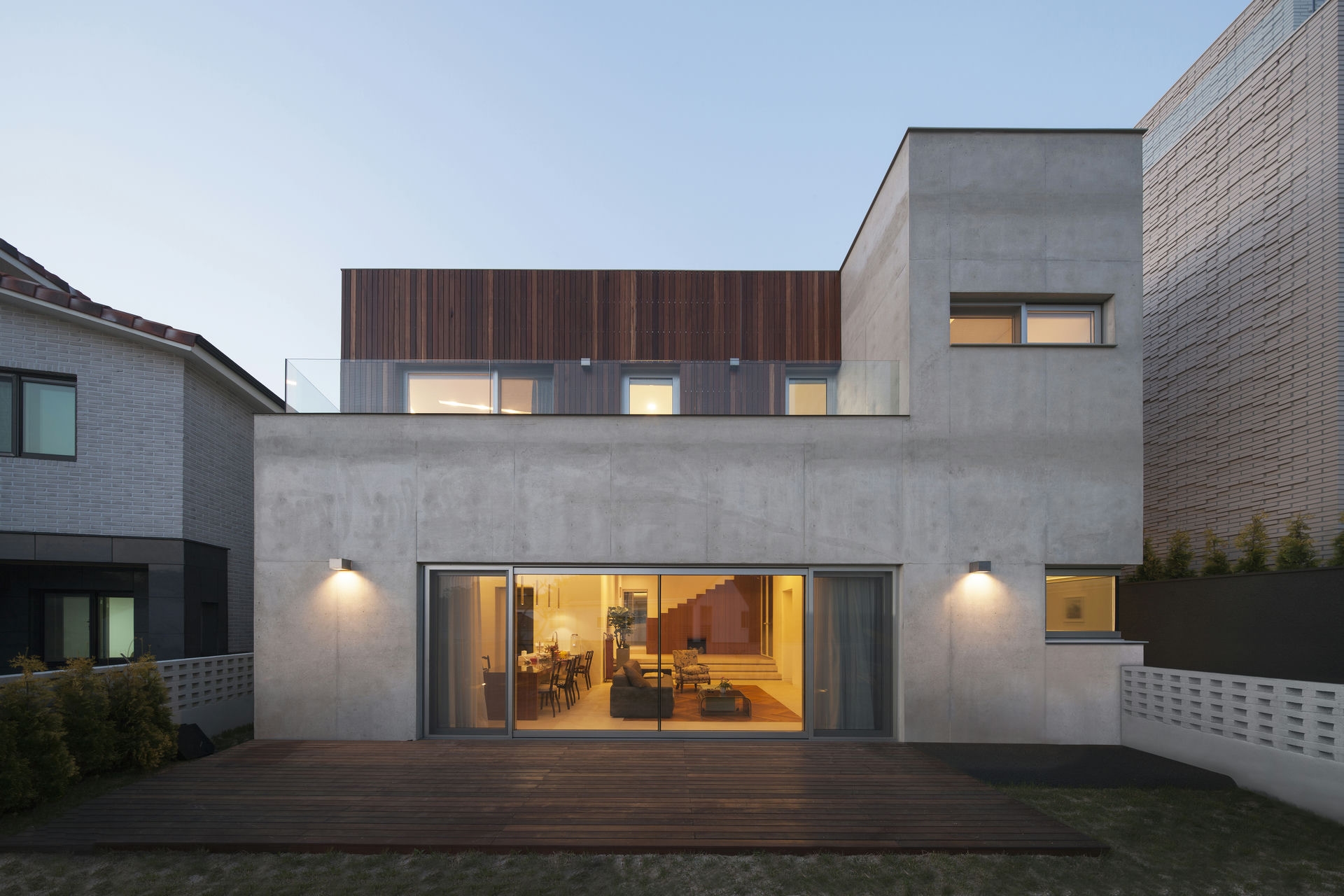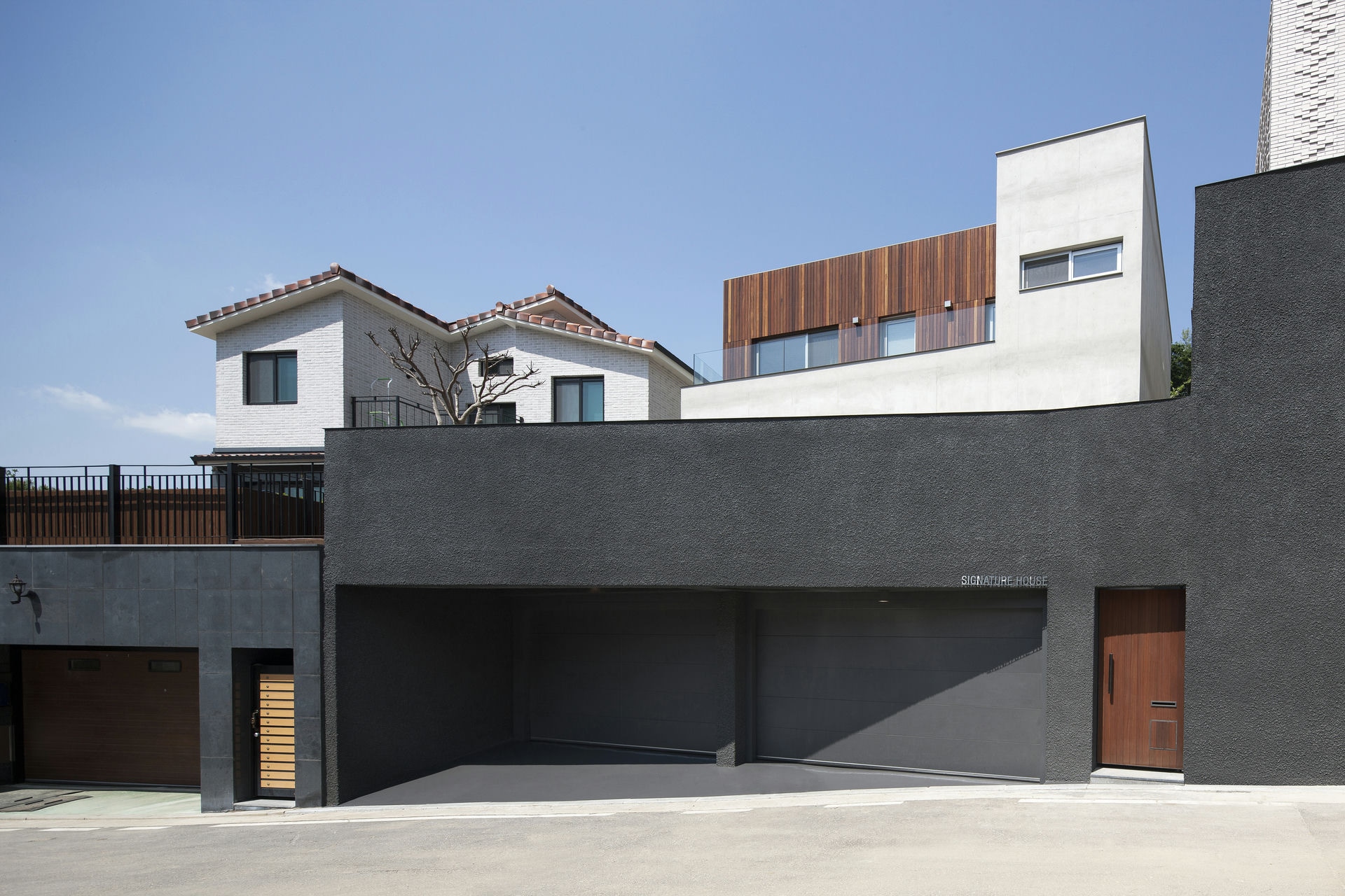 프로젝트 시그니처 하우스ㅣ백에이어소시에이츠 우리는 이 공간의 이름을 애둘러 표현하지 않고 직설적으로 시그니처 하우스라 정했다. 강렬했던 첫 만남의 인상을 가감 없이 드러냈기 때문이다. 전체 육십 평의 이 공간은 오십 대 사업가 부부가 노년을 보내기 위해 설계를 의뢰했다. 대화를 이어가면서 그들의 생각(집에 대한 의견들과 취향)을 이해하는 과정은 그들이 사는 모습 자체가 이 집의 형식을 구성하는 결정적인 단서가 되도록 했다. 단순함의 무게를 갖되 그 안에 온기를 품고 있는 공간이어야 했다. 밀집된 아파트 단지 사이, 숨구멍처럼 낮은 산으로 둘러싸인 마을에 위치한 대지는 마을 안쪽을 향한 남서쪽은 빛을 받기 좋고 마을 바깥쪽으로 향한 북동쪽은 근경으로 녹지를 조망할 수 있는 형태의 땅이었다. 대지를 경계로 마을 안쪽과 바깥쪽의 높이 차가 약 5미터, 지하층을 두어 마을 안쪽의 집들보다 높은 대지레벨을 계획할 수 있어 시각적 확장을 얻을 수 있는 조건이었다. Keywords 100Aassociates 100A 백에이어소시에이츠 백에이 안광일건축가 박솔하건축가 SIGNATUREHOUSE 시그니처하우스 용인전원주택 사는모습자체가집의형식을구성 온기를품은공간 시각적확장 계단 전이공간 심리적안정감 공간의흐름 외강내유 삶의축적 마을에 진입하여 마주하는 건축의 지하층에 해당하는 매스는 나란히 나열된 이웃집들과 위화감 없이 어우러지게 하되, 마을의 바깥쪽에서 마주하는 건축의 형태는 될수록 단순하게 하여 콘크리트의 무게만을 두어 주위와 대립시켰다. 앞마당의 면적을 최대로 확보하기 위해 내부공간을 뒤로 물리고 높은 벽 사이의 좁은 계단을 통해 진입하도록 하여 전이공간으로서 심리적 긴장감을 갖도록 했다. 이 긴장감을 안고 내부공간에 들어섰을 때 마주하는 농밀한 온기는 심리적 안정감을 준다. 공간과 공간의 조직을 가능한 단순하게 하고 크고 작은 프레임을 통해 다시 공간의 흐름을 갖게 함으로써 섬세한 균형을 이루는 공간이 되도록 했다. 결과적으로 이 공간은 주인으로부터 얻은 단서를 표면으로 드러내는 과정을 통해서 外剛內柔한 공간으로 구축된 셈이다. 주거공간은 결국 공간과 그곳에서 삶을 영위해 나아갈 사람만 남는다. 흥미로운 것은 그들의 사고와 삶의 방식을 이해하고 그것들을 공간에 담았을 때 비로서 그들의 삶이 담기어지기 시작한다는 것이다. 이 공간 또한 앞으로 그들의 삶이 축적되어 그들이 사는 모습 자체의 공간이 되길 바란다.SIGNATURE HOUSEㅣ100A associates 2018 위 치 | 경기도 용인시 기흥구 서천동 Yongin-si, Gyeonggi-do면 적 | 110.19㎡외 벽 | 노출콘크리트 위 발수코팅, 멀바우 데크재, 테라코사하라바 닥 | 포세린타일, 원목마루벽 | 도장, 무늬목천 정 | 도장창 호 | 시스템 창호설계ㆍ시공 | 백에이어소시에이츠 100A associates대표 건축가 | 안광일 Kwangil An, 박솔하 Solha Park글 | 백에이어소시에이츠 100A associates사진 | 김재윤 Jaeyoun Kim